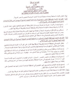 أولاً: تتولى القوات المسلحة وحدها مسئولي حراسة الحدود السياسية لجمهورية مصر العربية. ثانياً: القواعد الخاصة بالمنطقة الأولى (الممنوعة) المتاخمة للخدود الدولية السياسية على كافة الاتجاهات الاستراتيجية لجمهورية مصر العربية كالآتي: