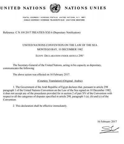 رسالة من الخارجية المصرية مودعة لدى الأمم المتحدة، في 2010، بشأن الحدود البحرية السعودية المصرية.