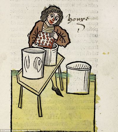 وصورةأخرى تظهر صبيا يقوم بإزالة العسل من المشط . في فترة العصور الوسطى كان العسل يستخدم في مجموعة متنوعة واسعة من الطرق، لعلاج السعال، ومدر للبول، وعلاج لبعض السموم وحتى تطبيق لتخليص الشعر من القمل.