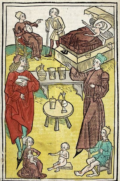 كتاب نادر مصور عمره 500 عام يظهر الأطباء يقومون بتحليل البول لتشخيص المرض وتنظيف القمل من شعر الصبي.