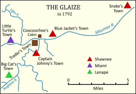 The Natives, short on food after the destruction of their crops, scattered to hunt before winter set in.[89] Little Turtle and Blue Jacket decided to abandon Kekionga, which had proven to be vulnerable to American raids, and relocate their towns at the confluence of the Maumee and Auglaize Rivers, where the principal Shawnee chief Kekewepelethy had already settled. This move had been encouraged by British Indian agent Alexander McKee since the new towns would be closer to the trade and military support offered by the British at Detroit.[90] This cluster of towns, known as "The Glaize," would become the headquarters of the Native Confederacy for the duration of the war.[91]