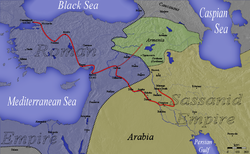 Julian had wintered at Antioch in Roman Syria. On 5 March 363 he set out north-east with his army by way of Aleppo[20] and Manbij, where fifty soldiers were killed in the collapse of a portico while they were marching under it.[21] The whole army mustered there, crossed the middle Euphrates and proceeded to Harran, known to the Romans as Carrhae, site of the famous battle in which the Roman general Crassus was defeated and killed in 53 BC. "From there two different royal highways lead to Persia," writes the eye-witness Ammianus Marcellinus: "the one on the left through Adiabene and across the Tigris; the one on the right through Assyria and across the Euphrates."[22] Julian made use of both. He sent a detachment (numbering 30 000 according to Ammianus but only 18 000 according to Zosimus) under Procopius and Sebastianus towards the Tigris where they were to join Arshak and his Armenian army. They were then to attack the Persians from the north.[23]