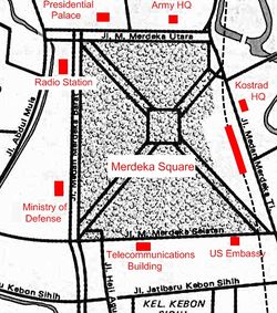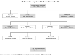 حركة الثلاثين من سبتمبر (إندونيسية: Gerakan 30 September، واختصارها G30S، وتُعرف أيضاً بالاختصار Gestapu للتعبير Gerakan September Tiga Puluh وأحياناً تُدعى Gestok، التي هي اختصار Gerakan Satu Oktober، حركة أول أكتوبر) كانت منظمة تقول عن نفسها أنها مناهضة للشيوعية في القوات المسلحة الوطنية الإندونيسية members who, in the early hours of 1 October 1965, assassinated six Indonesian Army generals in an abortive coup d'état.[1] Later that morning, the organisation declared that it was in control of media and communication outlets and had taken President سوكارنو under its protection. By the end of the day, the coup attempt had failed in Jakarta at least. Meanwhile, in central Java there was an attempt to take control over an army division and several cities. By the time this rebellion was put down, two more senior officers were dead.