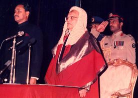 حفل حلف اليمين الرئاسي بعد انتخابات 1986، ويظهر في الصورة أيضاً وزير العدل ووزير الدفاع (1984-1989) البريجادير جنرال أب.م. إلياس.