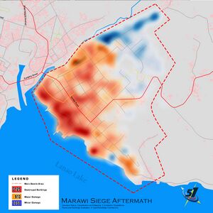 205. ^ Malicdem, Ervin (November 30, 2017). "Aftermath of the Battle of Marawi". Schadow1 Expeditions. Archived from the original on December 16, 2017. Retrieved December 15, 2017. The Marawi crisis has resulted to the damage of over 95% of the structures in the main battle area of about 4 square kilometers. Of those affected, 3,125 structures were completely destroyed or uninhabitable, 913 buildings are heavily damaged, while 1,232 structures were partially damaged.