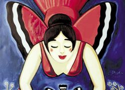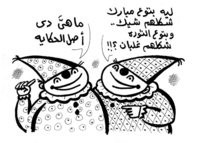 ثم من معرضه الحالى في قاعة بيكاسو والذى بحث فيه باجتهاده المآلوف بتصنيف مواضيع معرضه إلى أربع مجموعات ذكرها في مقدمة ورق المعرض بأنها مجموعة ` البطيخ ` و مجموعة `المرأة الملاك` ومجموعة `ألعاب البنات` ومجموعة `ألهة الإصلاح` وكلها هى استمرار لرؤيته الاستعراضية فيما عدا بعض من لوحات البطيخ والخيل بمناخها الداخلى ومدلولها الآسر وتحيرنى دائما عيون عناصره البشرية من نساء مغريات إلى فتيات صغيرات أن لهن وجوه واحدة التعبير المحايد فلا يقلن شئ في نظرة بلا تعبير سواء فرح أو حزن أو قبول أو رفض فلا فرق بين روح الفتاة وروح المرأة هذا رغم استعانة الفنان بخلق مناخ درامى في الخلفية أو فيما يحيطهن من عناصر تنغلق عليها أطر اللوحة بشدة كى تؤكدها رغم هذا حين يأتى التعبير واحدا يصبح المحيط ديكورى رغم إجادته في خلق مناخ مثير إلى أن تأتى شخوصه في المقدمة وبفتياته الصغيرات المربوطات الأعين في لعبة الاستغماية أو نطة الحبل ليبدن كعرائس الماريونيت مشدودات الأذرع والأرجل وهذا التغيير عكس ما يمثله اللعب من حرية.