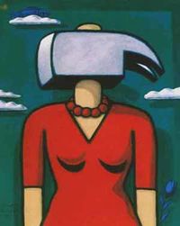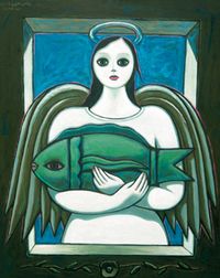فرأينا البيضة علقت على العتبة فوق العذراء وهى بدون شك رمز لبيضة كونية أو رمز القيام .لذلك لماذا نفس الرموز عند الفنان الكبير التونى رغم تضاد المدلول وتضاد الحالة والشخوص بما يتناقض ومدلول الرمز من لوحة لأخرى ومن مجموعة من مجموعات المعرض الأربع والأخرى مضافا إليها رمزية الأهرامات والسمكة وهذا التكرار للرموز في مجموعات الفنان المتناقضة أفقد الرمز مدلولة وسحره .