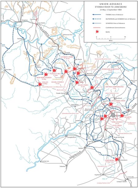جيش تنسي، بقيادة جونستون، انسحب باتجاه أطلنطا في وجه مناورات التفاف متتالية من مجموعة جيوش شرمان. وفي يوليو، قام الرئيس الكونفدرالي جفرسون ديڤس، باستبدال جونستون بالجنرال الأكثر عدائية جون بل هود، الذي بدأ في تحدي الجيش الاتحادي في سلسلة من الهجمات الأمامية الباهظة. وفي النهاية حوصر جيش هود في أطلنطا وسقطت المدينة في 2 سبتمبر، ممهدة الساحة لبدء مسيرة شرمان إلى البحر والتعجيل بنهاية الحرب.
