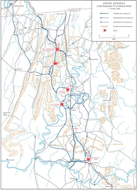 Demonstration against Resaca, with combats at Snake Creek Gap, Sugar Valley, and near Resaca. |