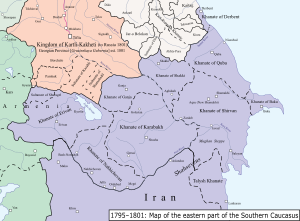 Russian expansion into the South Caucasus, starting with the establishment of a protectorate over Kartli-Kakheti in 1783, ultimately led to a confrontation between Iran and Russia for control of the khanates.[13] The Russo-Iranian War of 1804–1813 ended with the Treaty of Gulistan, which amongst other things led to the Iranian loss of seven khanates: Ganja, Karabakh, Quba, Derbent, Baku, Shirvan, and Shaki.[14][15] The northern and central part of the Talysh Khanate, along with a part of northern Erivan (Shuregol), was also ceded to the Russian Empire.[14] Following the conclusion of the Russo-Iranian War of 1826–1828 and the signing of the Treaty of Turkmenchay, Iran also lost the Erivan and Nakhichevan khanates to the Russians.[16] Politically, the loss of the khanates was devastating for the Qajar dynasty because it damaged their reputation as the guardian of the Guarded Domains of Iran.[17]