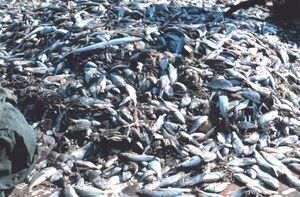 Commercial fisheries can have both positive and negative effects on the greater crested tern. Juvenile survival rates are improved where trawler discards provide extra food, and huge population increases in the southeastern Gulf of Carpentaria are thought to have been due to the development of a large prawn trawl fishery.[35] Conversely, purse-seine fishing reduces the available food supply, and sizeable fluctuations in the numbers of great crested terns breeding in the Western Cape of South Africa are significantly related to changes in the abundance of pelagic fish, which are intensively exploited by purse-seine fishing.[34] Terns may be killed or injured by collisions with trawl warps, trapped in trawls or discarded gear, or hooked by longline fishing, but, unlike albatrosses and petrels, there is little evidence that overall numbers are significantly affected.[14]