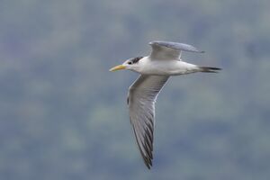 All populations of greater crested tern disperse after breeding. When Southern African birds leave colonies in Namibia and Western Cape Province, most adults move east to the Indian Ocean coastline of South Africa. Many young birds also travel east, sometimes more than 2،000 km (1،200 mi), but others move northwards along the western coast. T. b. thalassina winters on the east African coast north to Kenya and Somalia and may move as far south as Durban. Populations of T. b. velox breeding from the Persian Gulf eastwards appear to be sedentary or dispersive rather than truly migratory, but those breeding in the Red Sea winter south along the east African coast to Kenya.[14] T. b. cristatus mostly stays within 400 km (250 mi) of its colonies, but some birds wander up to around 1،000 km (620 mi).[21] This species has occurred as a vagrant to Hawaii,[22] New Zealand,[23][24] North Korea,[23] Jordan,[23] and Israel.[18]
