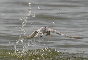 Terns have red oil droplets in the cone cells of the retinas of their eyes. This improves contrast and sharpens distance vision, especially in hazy conditions.[38] Birds that have to see through an air/water interface, such as terns and gulls, have more strongly coloured carotenoid pigments in the cone oil drops than other avian species.[39] The improved eyesight helps terns to locate shoals of fish, although it is uncertain whether they are sighting the phytoplankton on which the fish feed, or observing other terns diving for food.[40] Tern's eyes are not particularly ultraviolet sensitive, an adaptation more suited to terrestrial feeders like the gulls.[41]