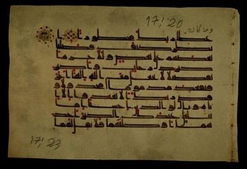 صورة صفحة من مصحف (الآيات 20-23 من سورة الإسراء) مكتوب بخط المشق، يعود إلى القرن الأول أو القرن الثاني الهجريين