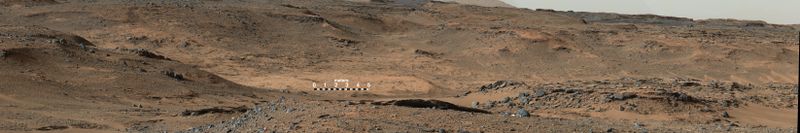 Curiosity's SW view near "Darwin Outcrop" (lower-center) (Waypoint 1; September 7, 2013).