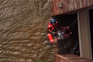 A Coast Guard Aviation Survival Technician assisting with the rescue of a pregnant woman during Hurricane Katrina in 2005.