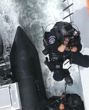 Members of the U.S. Coast Guard Maritime Security Response Team (MSRT) hook and climb onto a target showing the skills needed to complete a variety of missions dealing with anti-terrorism, protecting local maritime assets, and harbor and inshore security patrols as well as detecting, stopping, and arresting submerged divers, using the Underwater Port Security System.
