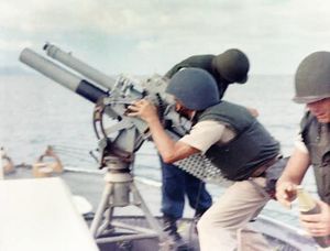 Gun crew on board USCGC Point Comfort (WPB-82317) firing 81mm mortar during bombardment of suspected Viet Cong staging area one mile behind An Thoi in August 1965