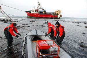 A boatswain's mate watches from the side port door as the Coast Guard Cutter Bertholf's Over-The-Horizon small boat departs to receive personnel from the Coast Guard Cutter Chandeleur in 2008.