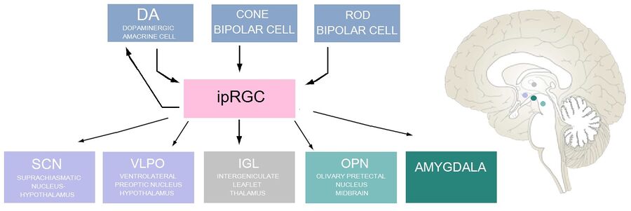 تشمل الأهداف الأخرى لما بعد التشابك للخلايا العقدية الشبكية الحساسة للضوء ما يلي: الوريقة بين النواة الركبية (IGL)، وهي مجموعة من الخلايا العصبية الموجودة في المهاد ، والتي تلعب دورًا في التنشيط اليوماوي ؛ النواة أمام السقفية الزيتونية (OPN) ، وهي مجموعة من الخلايا العصبية في الدماغ المتوسط تتحكم في منعكس الحدقة الضوئية ؛ النواة البطنية الجانبية (VLPO) ، الموجودة في منطقة ما تحت المهاد وهي مركز تحكم للنوم; as well as to[clarify] tلوزة المخ.[1]