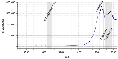 listen)). Important industrial companies were founded by Richard Hartmann, Louis Schönherr and Johann von Zimmermann. Chemnitz became a centre of innovation in the kingdom of Saxony and later in Germany. In 1913, Chemnitz had a population of 320,000 and, like Leipzig and Dresden, was larger at that time than today. After losing inhabitants due to the First World War Chemnitz grew rapidly again and reached its all-time peak of 360,250 inhabitants in 1930. Thereafter, growth was stalled by the world economic crisis.