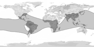 In the Asia-Pacific region, they occur across East Asia, from north to 50 °N latitude in Sakhalin,[28] to south to northern Australia, and west to India and the Himalayas. China, Japan, Korea, India and Australia, all have several endemic populations.[29] They also occur in small numbers in sub-Saharan Africa, confined to tropical areas, from southern Senegal in the north to southern Mozambique and Madagascar in the south.[30] In the Americas, bamboo has a native range from 47 °S in southern Argentina and the beech forests of central Chile, through the South American tropical rainforests, to the Andes in Ecuador near 4،300 m (14،000 ft), with a noticeable gap through the Atacama Desert.[بحاجة لمصدر]
