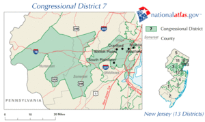 دائرة الكونگرس السابعة في نيوجرزي تشمل مقاطعة هنتردون بالكامل، وأجزاء من مقاطعات إسكس، موريس، سمرست، يونيون، ووارن.