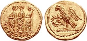 The first coins produced by the Geto-Dacians were imitations of silver coins of the Macedonian kings Philip II and Alexander the Great. Early in the 1st century BC, the Dacians replaced these with silver denarii of the Roman Republic, both official coins of Rome exported to Dacia, as well as locally made imitations of them. The Roman province Dacia is represented on the Roman sestertius coin as a woman seated on a rock, holding an aquila, a small child on her knee. The aquila holds ears of grain, and another small child is seated before her holding grapes.
