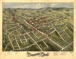 The central part of Danbury was incorporated as a borough in 1822. The borough was reincorporated as the city of Danbury on April 19, 1889. The city and town were consolidated on January 1, 1965.
