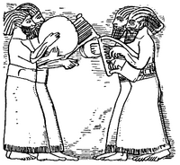 An engraved bronze cup from Lorestān at the National Museum of Iran in Tehran, portrays a double ney (end-blown reed pipes), chang (harp), and a daf in a shrine or court processional, as similarly documented in Egypt, Elam, and the Persian province of Babylonia where music was arranged for performance by large orchestral ensembles.[1]