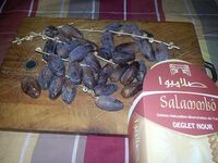 دقلة نور هو نوع من أنواع التمور التي تنتشر بشكل رئيسي في الجزائر وفي بعض الأماكن في تونس.[1][2] Commonly referred to as the "queen of all dates",[3] the authentic Algerian[4] Deglet Nour date has a soft touch, a translucent light color and a soft honey-like taste, characteristics which distinguish it from other dates.