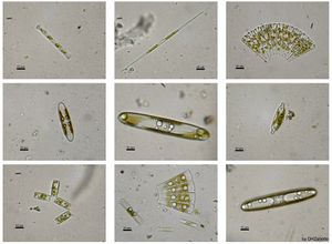 الدياتوم Diatom كائن حي مجهري وحيد الخلية. توجد الدياتومات في المحيطات والبحيرات العذبة والأنهار، والجداول، وفي التربة الرطبة، وداخل الماء. تعيش الدياتومات فوق الصخور والرمال والنباتات، أو تطفو بِحرِّية على سطح الماء. والدياتومات معروفة جيدًا بوصفها في مجموعة الكائنات الحية المندفعة في المناطق العلوية من المحيطات. وتدعى هذه الكائنات الحية بالعوالق المائية.