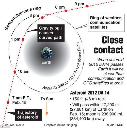 إقتراب محدق: الكويكب 2012 DA14 يمر على إرتفاع 17.100 كيلومترا من الأرض في حوالي 07:30. "وفيما يتعلق بعلم الفلك، هذا يعتبر قريبا جدا، حسب قول الفلكي وخبير الكويكبات دانيال براون من جامعة نوتنغهام ترنت