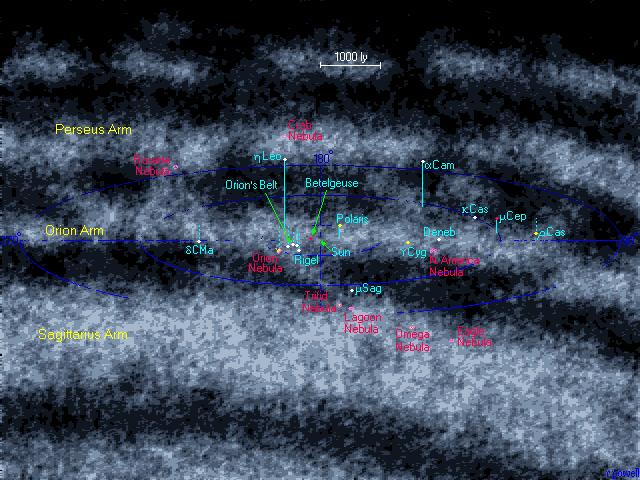 ويبين الشكل أيضا اتجاه دوران المجموعة الشمسية في المجرة، وهي تبعد عن المركز نحو 26 ألف سنة ضوئية. وإذا نظرنا إلى السماء ليلا فإننا نرى الطريق اللبني ممتدا عبر السماء من أفق إلى الأفق الآخر، وذلك لأننا نرى قرص المجرة من الجانب. كما نلاحظ مركز المجرة حيث تزيد فيه تجمعات النجوم وتشتد إضاءته. وتحجب شدة الإضاءة وكثرة الغبار الكوني في مركز المجرة رؤية ما ورائها من النجوم، وتلك المنطقة مبينة في الشكل Obsured ، بمعني مختفية وغير واضحة.
