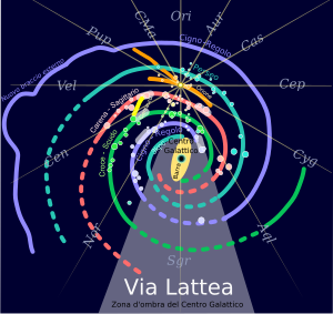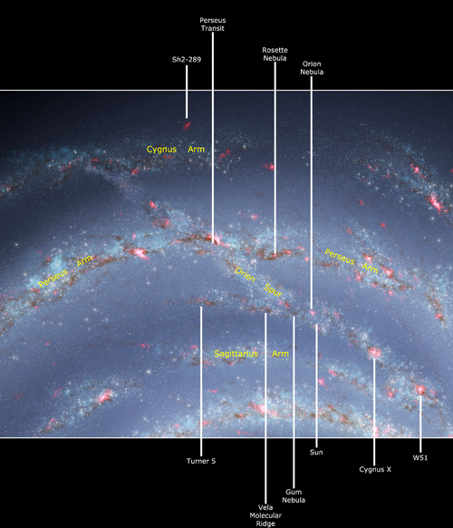 ويوضح الشكل مكان تواجد المجموعة الشمسية (البقعة الصفراء)، وهي تنتمي إلى ذراع الجبار Orion قريبا من ذراع رامي القوس وذراع حامل رأس الغول قريبا من حافة المجرة. ويعتبر ذراع الدجاجة المجري Norma Arm أو Cygnus Arm هو أقرب الأذرعة إلى مركز المجرة.