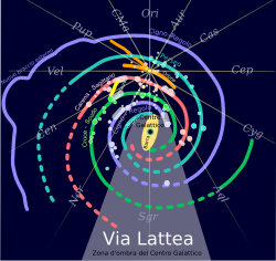 وتتخذ المجرة شكلا قرصيا مسطحا تقريبا منتفخا عند المركز حيث يكثر وجود النجوم ويشتد اصدارها للضوء. ونظرا لاختلافات في الجاذبية بسبب كثافة النجوم من مكان لآخر وفي نفس الوقت نظرا لدوران النجوم حول مركز المجرة، حيث تكون سرعة النجوم عند المركز أسرع من سرعة النجوم على حافة المجرة، فيؤدي ذلك إلى تكون الأذرع الحلزونية التي تكثر فيها النجوم وتجمعات النجوم والغاز والغبار الكوني.