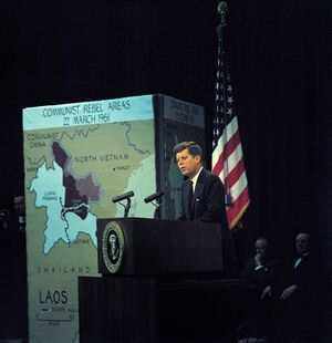 When briefing Kennedy, Eisenhower emphasized that the communist threat in Southeast Asia required priority. Eisenhower considered Laos to be "the cork in the bottle;" if it fell to communism, Eisenhower believed other Southeast Asian countries would as well.[138] The Joint Chiefs proposed sending 60,000 American soldiers to uphold the friendly government, but Kennedy rejected this strategy in the aftermath of the failed Bay of Pigs invasion. He instead sought a negotiated solution between the government and the left-wing insurgents, who were backed by North Vietnam and the Soviet Union.[139] Kennedy was unwilling to send more than a token force to neighboring Thailand, a key American ally. By the end of the year, Harriman had helped arrange the International Agreement on the Neutrality of Laos, which temporarily brought an end to the crisis, but the Laotian Civil War continued.[140] Though he was unwilling to commit U.S. forces to a major military intervention in Laos, Kennedy did approve CIA activities in Laos designed to defeat communist insurgents through bombing raids and the recruitment of the Hmong people.[141]