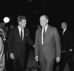 On June 4, 1961, the president met with Khrushchev in Vienna, where he made it clear that any treaty between East Berlin and the Soviet Union that interfered with U.S. access rights in West Berlin would be regarded as an act of war.[87] The two leaders also discussed the situation in Laos, the Congo Crisis, China's fledgling nuclear program, a potential nuclear test ban treaty, and other issues.[88] Shortly after Kennedy returned home, the Soviet Union announced its intention to sign a treaty with East Berlin that would threaten Western access to West Berlin. Kennedy, depressed and angry, assumed that his only option was to prepare the country for nuclear war, which he personally thought had a one-in-five chance of occurring.[87]