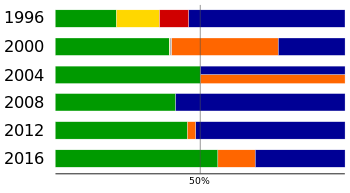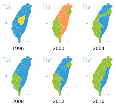 Comparison of the vote percentages in the direct presidential elections. : Democratic Progressive Party candidates : Kuomintang candidates : People First Party candidates, or independents predecessors. : New Party candidates or endorsement : Other independents |
