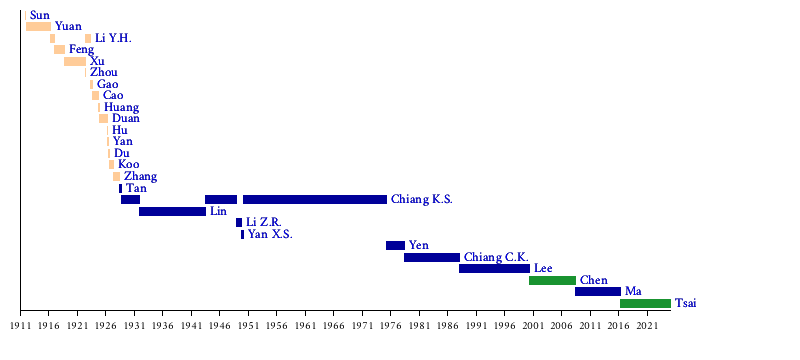 | أول شاغل | Sun Yat-sen (as Provisional President) Chiang Kai-shek (under 1947 Constitution) Lee Teng-hui (directly elected under the Additional Articles) |