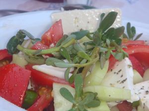 Australian Aborigines use the seeds of purslane to make seedcakes. Greeks, who call it andrakla (αντράκλα) or glystrida (γλυστρίδα), use the leaves and the stems with feta cheese, tomato, onion, garlic, oregano, and olive oil. They add it in salads, boil it, or add it to casseroled chicken. In Turkey, besides being used in salads and in baked pastries, it is cooked as a vegetable similar to spinach. Called Bakleh tn Lebanon, is eaten raw in a famous salad called fattoush, and cooked as a garniture in fatayeh (triangular salted pastries). In Albania, known as burdullak, it also is used as a vegetable similar to spinach, mostly simmered and served in olive oil dressing, or mixed with other ingredients as a filling for dough layers of byrek. In the south of Portugal (Alentejo), baldroegas are used as a soup ingredient. In Pakistan, it is known as qulfa and is cooked as in stews along with lentils, similarly to spinach, or in a mixed green stew.