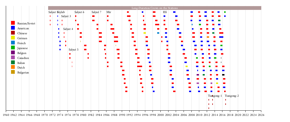 Chen Dong (astronaut)Jing HaipengWang YapingZhang XiaoguanNie HaishengLiu YangLiu WangJing HaipengKathleen RubinsTakuya OnishiAnatoli IvanishinJeffrey WilliamsOleg SkripochkaAleksey OvchininTimothy PeakeTimothy KopraYuri MalenchenkoAidyn AimbetovAndreas MogensenSergey VolkovKjell N. LindgrenKimiya YuiOleg KononenkoScott KellyMikhail KorniyenkoGennady PadalkaTerry W. VirtsSamantha CristoforettiAnton ShkaplerovBarry E. WilmoreYelena SerovaAleksandr SamokutyayevAlexander GerstGregory R. WisemanMaksim SurayevSteven R. SwansonOleg ArtemyevAleksandr SkvortsovKoichi WakataRichard A. MastracchioMikhail TyurinMichael S. HopkinsSergey RyazanskyOleg KotovLuca ParmitanoKaren L. NybergFyodor YurchikhinChristopher J. CassidyAleksandr MisurkinPavel VinogradovThomas H. MarshburRoman RomanenkoChris HadfieldEvgeny TarelkinOleg NovitskiyKevin A. FordAkihiko HoshideYuri MalenchenkoSunita L. WilliamsSergei RevinGennady PadalkaJoseph M. AcabaDonald PettitAndré KuipersOleg KononenkoDaniel C. BurbankAnatoli IvanishinAnton ShkaplerovSatoshi FurukawaMichael E. FossumSergey Alexandrovich VolkovRonald J. GaranAleksandr SamokutyayevAndrei BorisenkoPaolo NespoliCatherine G. ColemanDimitri KondratyevOleg SkripochkaAleksandr KaleriScott Kelly (astronaut)Fyodor YurchikhinShannon WalkerDouglas H. WheelockTracy Caldwell DysonMikhail KorniyenkoAleksandr Skvortsov (cosmonaut)Soichi NoguchiTimothy CreamerOleg KotovMaksim SurayevJeffrey WilliamsNicole StottRobert ThirskRoman RomanenkoFrank De WinneTimothy KopraMichael R. BarrattGennady PadalkaKoichi WakataSandra MagnusYuri LonchakovMichael FinckeGregory ChamitoffOleg KononenkoSergey VolkovGarrett ReismanLéopold EyhartsDaniel TaniYuri MalenchenkoPeggy WhitsonClayton AndersonOleg KotovFyodor YurchikhinSunita WilliamsMikhail TyurinMichael Lopez-AlegriaThomas ReiterJeffrey WilliamsPavel VinogradovValery TokarevWilliam McArthurJohn PhilipsSergei KrikalevSalizhan SharipovLeroy ChiaoMichael FinckeGennady PadalkaAlexander KaleriMichael FoaleEdward LuYuri MalenchenkoDonald PettitNikolai BudarinKenneth BowersoxSergei TreshchevPeggy WhitsonValery KorzunCarl WalzDaniel BurschYury OnufrienkoVladimir DezhurovMikhail TyurinFrank CulbertsonJames VossSusan HelmsYuri UsachevYuri GidzenkoSergei KrikalevWilliam ShepherdAleksandr KaleriSergei ZalyotinJean-Pierre HaigneréViktor AfanasyevSergei AvdeyevGennady PadalkaNikolai BudarinTalgat MusabayevAndrew ThomasDavid WolfPavel VinogradovAnatoly SolovyevMichael FoaleAleksandr LazutkinVasili TsibliyevJerry LinengerJohn BlahaAleksandr KaleriValery KorzunShannon LucidYury UsachevYuri OnufrienkoThomas ReiterSergei AvdeyevYuri GidzenkoNikolai BudarinAnatoly SolovyevNorman ThagardGennady StrekalovVladimir DezhurovYelena KondakovaAleksandr ViktorenkoTalgat MusabayevYuri MalenchenkoValeri PolyakovYury UsachevViktor AfanasyevAleksandr SerebrovVasili TsibliyevAleksandr PoleshchukGennadi ManakovSergei AvdeyevAnatoly SolovyevAleksandr KaleriAleksandr ViktorenkoAleksandr VolkovSergei KrikalevAnatoly ArtsebarskyMusa ManarovViktor AfanasyevGennady StrekalovGennadi ManakovAleksandr BalandinAnatoly SolovyevAleksandr SerebrovAleksandr ViktorenkoSergei KrikalevAleksandr VolkovValeri PolyakovAleksandr Panayotov AleksandrovMusa ManarovVladimir TitovAleksandr AleksandrovYuri RomanenkoAleksandr LaveykinVladimir SolovyovLeonid KizimVladimir SolovyovLeonid KizimAlexander VolkovVladimir VasyutinVladimir DzhanibekovViktor SavinykhOleg AtkovVladimir SolovyovLeonid KizimAleksandr Pavlovich AleksandrovVladimir LyakhovValentin LebedevAnatoli BerezovoyViktor SavinykhVladimir KovalyonokValery RyuminLeonid PopovGeorgi Ivanov (cosmonaut)Valery RyuminVladimir LyankhovAleksandr IvanchenkovVladimir KovalyonokGerogi GrenchoYuri RomanenkoYuri GlazkovViktor GorbatkoVitali ZholobovBoris VolynovVitali SevastyanovPyotr KlimukAleksei GubarevGeorgi GrechkoPavel PopovichYuri ArtyukhinEdward GibsonWilliam PogueGerald CarrOwen GarriotJack LousmaAlan BeanJoeseph KerwinPaul WeitzPete ConradVladislav VolkovViktor PatsayevGeorgi Dobrovolski
