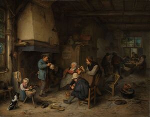 A stay in Haarlem by the Flemish master of peasant tavern scenes Adriaen Brouwer, from 1625 or 1626, gave Adriaen van Ostade his lifelong subject, though he often took a more sentimental approach. Before Brouwer, peasants had normally been depicted outdoors; he usually shows them in a plain and dim interior, though van Ostade's sometimes occupy ostentatiously decrepit farmhouses of enormous size.[51]