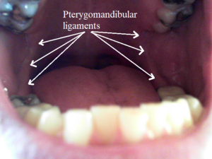 When the mandible is splinted for gradual realignment (such as to treat sleep apnea), the pterygomandibular ligament slightly resists the realignment.[5]