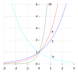 رسومات y=ax لمختلف الأساسات a: base 10 (green), base e (red), base 2 (blue), and base ½ (cyan). Each curve passes through the point (0,1) because any nonzero number raised to the power 0 is 1. At x=1, the y-value equals the base because any number raised to the power 1 is itself.