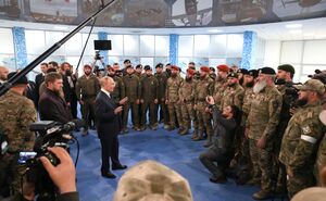 قدريوڤ وپوتن برفقة القادة والمتطوعين الشيشان في گودرمس، 20 أغسطس 2024.