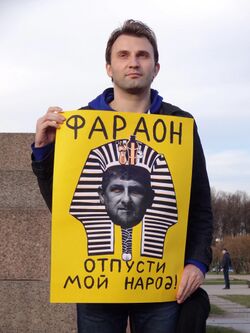 پيتر ڤوسكرسنسكي-ستكانوڤ يحمل ملصقاً لرمضان قديروڤ مطالباً "يا فرعون، دع شعبي يرحل!". احتجاجاً على إبادة مجتمع الميم في الشيشان، 17 مايو 2017.