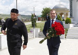 رئيس الوزراء الروسي دميتري مدڤييدڤ وقديروڤ عند مقبرة أحمد قديروڤ، يونيو 2012.