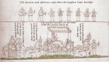 موكب تتويج إلزابث: روبرت ددلي على صهوة جواد في أقصى اليسار، يقود palfrey الشرف.