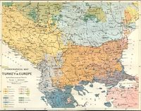 رومليا الشرقية (الخطوط الحمراء والبرتقالية) بين بلغاريا والدولة العثمانية. | |||||||||